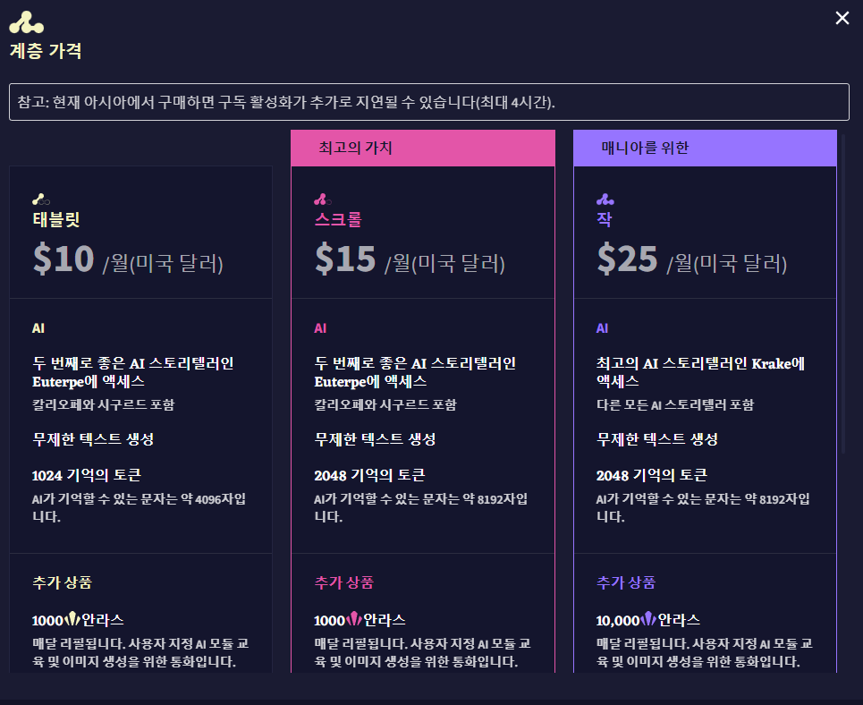 노벨 Ai의 가격이다. 태블릿은 10달러, 스트롤은 15달러, 작(otus)는 25달러이다. 사실 텍스트 생성은 상관 없다. 요즘 나온 Chat GPT가 압도하기 때문이고, 사실 사용해보니 스토리텔링에 전혀 도움이 되지 않았다. 노벨 AI는 그림만 뽑으면 된다.